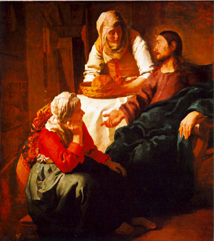 The figures form a triangle, with Christ pointing to Mary, but looking at Martha. The background is merely sketched, strengthening the closeness of the group. Christ was invited home for a meal by Martha, and she is preparing the food while Mary is chatting with Christ and Martha is aggrieved; He tells her "Mary hath chosen that good part, which shall not be taken away from her" (Luke 10:41). This is often interpreted as a justification of the contemplative life.