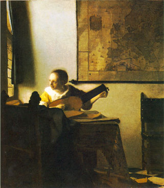 A young woman tunes her lute by a window, looking out at something happening