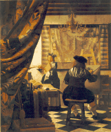 The painter, dressed in fanciful, not contemporary, clothing, works with an almost empty canvas, symbolic of the new republic of the United Netherlands. Furthermore, the easel on which he paints is directly in front of the new country.